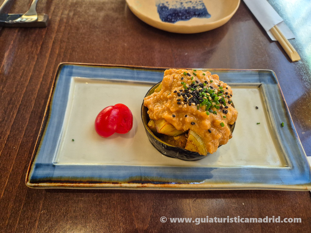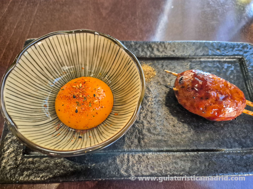 Tenemos que decir que nos ha encantado el menú degustación: cada plato era igual o más rico que el anterior. Además, al servir cada plato te indican lo que lleva y cómo debes comerlo, lo cual se agradece infinito. Hemos empezado con una ensalada fresquita, que se agradecía por el calor que hacía fuera, luego hemos continuado con distintos platos entrantes, como edamame o la berenjena, que está espectacular, para luego ir a probar las cosas más famosas del local: los yakitoris. En nuestro caso, hemos probado el plato estrella de la casa, el picadillo de pollo casero tsukune con huevo a baja temperatura, hecho con más de 20 ingredientes, y que estaba realmente delicioso, y el de wagyu, que estaba espectacular y la carne se deshacía al entrar en la boca. De postre hemos tomado la torrija de té verde con helado de vainilla, y antes del postre nos han servido un té verde para cambiar de sabores.