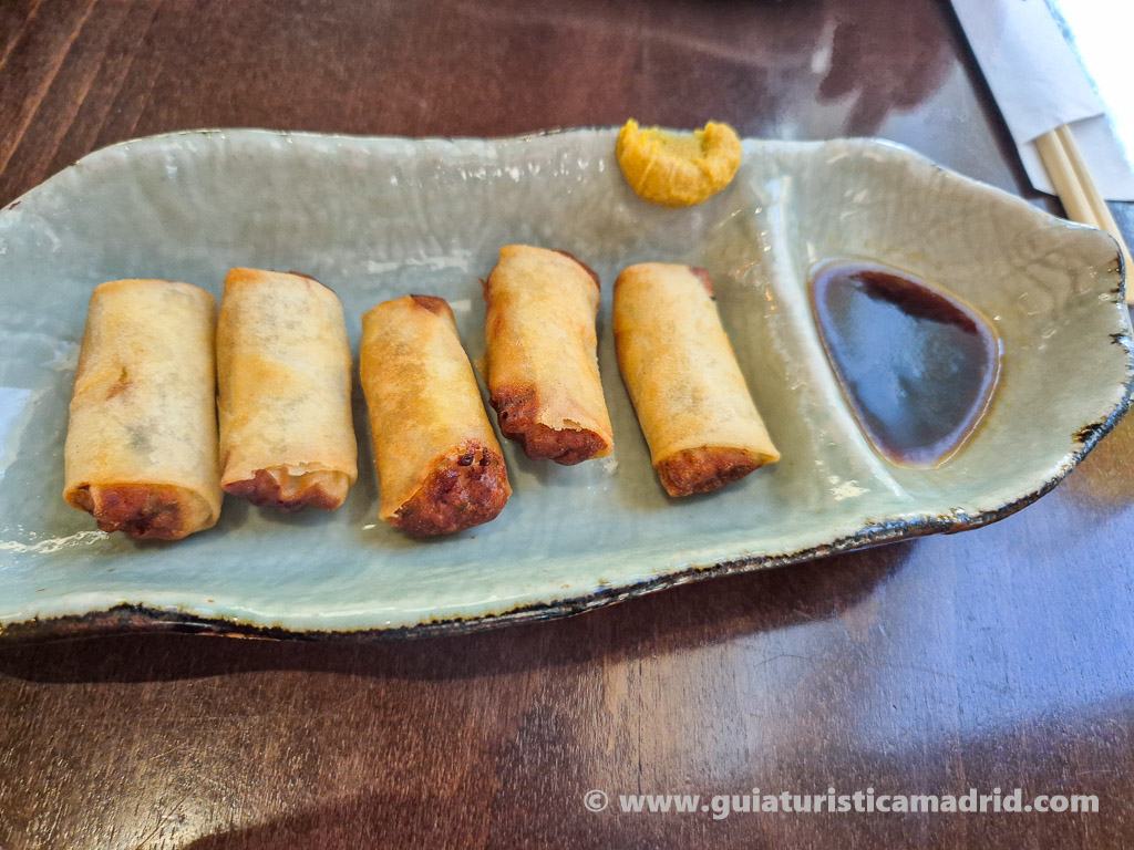 Comenzamos con una ensalada que estaba muy fresca y rica, continuamos con pollo rebozado (impresionante) con un ball de berenjena y patata, el tercer plato era lengua de vaca a la brasa (riquísima), y cuarto plato fueron unas setas, y quinto plato eran unas cucharas de arroz con huevo, el sexto fueron las famosas brochetas que estaban espectaculares, el séptimo plato fue un roll abierto de atún, alga y arroz , antes del postre nos pusieron un té verde y finalmente el postre que era una torrija con helado de matcha.